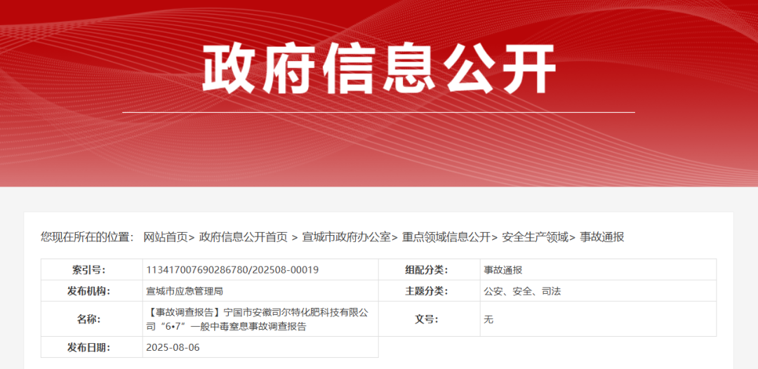 6月7日,安徽省宣城市安徽司尔特化肥科技有限公司在检维修过程中发生一起中毒窒息事故,造成1人死亡、2人受伤,直接经济损失205万元。