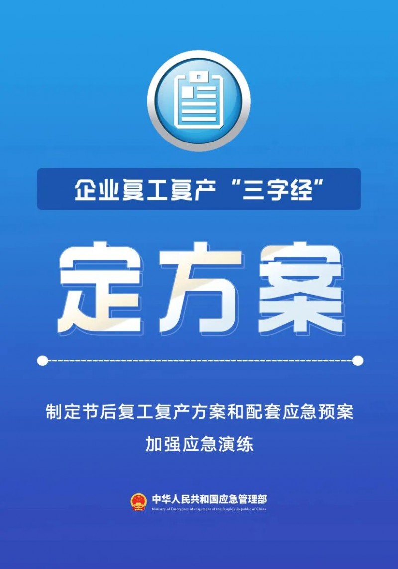 企业陆续迎来复工复产,心态调整、设备运作、恶劣天气…………安全防范不可疏忽大意,企业如何结合自身实际制定安全防范措施,落实节后安全复工复产工作企业复工复产“三字经”,一起来看看。