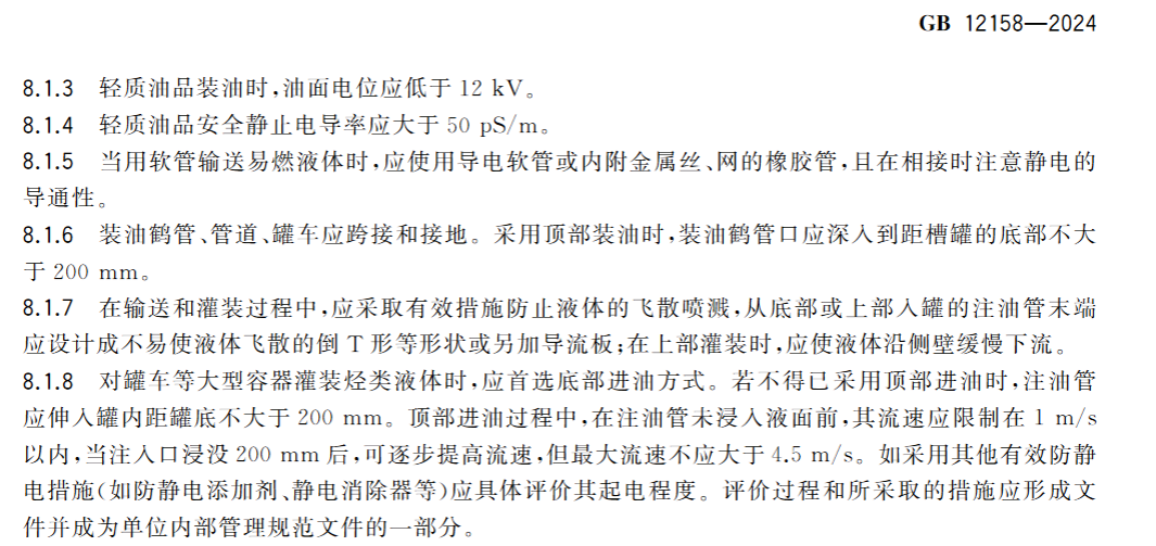 今年1月1日起开始实施的《防止静电事故通用要求》(GB 12158—2024),涉及作业场所存在静电引燃(爆)风险场所的静电防护,包括对作业场所的静电接地要求,人员静电防护措施,物料存储和运输注意事项等,适用领域包括石油、石化、加油站、矿山等作业场所和人员操作所产生的静电可能引起火灾和爆炸风险场所的静电防护,不适用于火炸药、电火工品、烟花爆竹的静电危害防范。一起来看看吧。