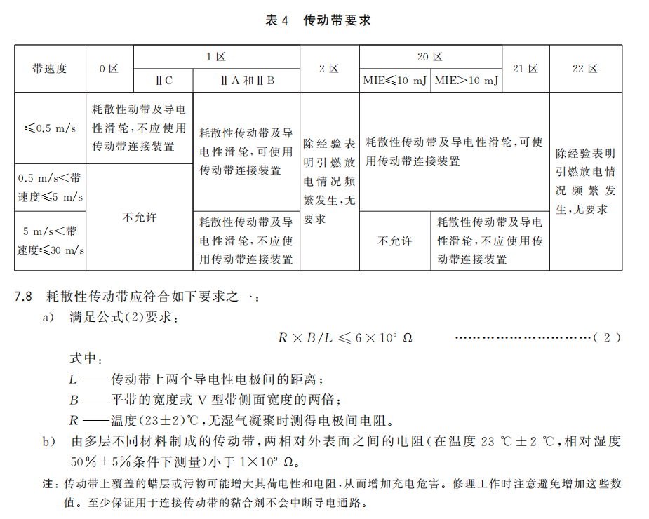 2.固态物料:根据危险场所等级选择耗散性传送带及导电性滑轮,按危险场所等级选用耗散性传动带,满足电阻限值要求。